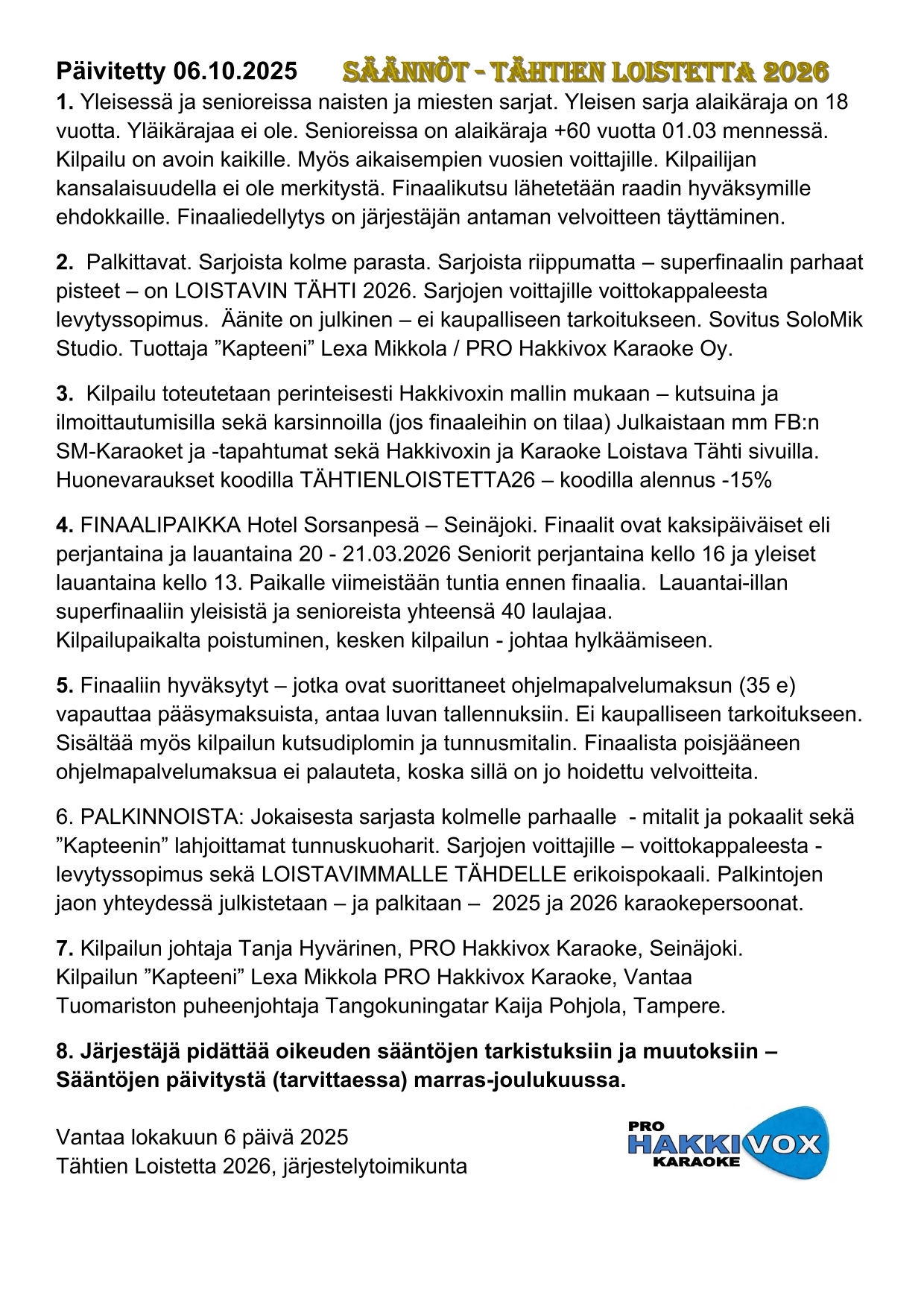 Meille on tullut kyselyjä. Miksi pitää nyt jo ilmoittautua? Kilpailumme "Kapteeni" Lexa Mikkola on pisimpään Suomessa karaokekilpailuita järjestänyt taustahenkilö. Joten hän, jos kukaan tietää, että karaokemaailmassa kaikki ei ole aivan niin kuin pitäisi. Viime maaliskuun finaaliakin jouduimme siirtelemään kahteen kertaan. Väistäessämme toisia kilpailuita - jotka "halusivat" samat päivät kuin me. NYT olemme olleet ajoissa liikkeellä. Suomen vanhimpana karaokekilpailujen järjestäjänä Hakkivox on luonut oman ja toimivan formaatin. Jota vielä vähän parantelemme 2026 finaaliin. Uutuutena on se, että omat finaalikappaleet tarvitsee ilmoittaa vasta finaaliesitykseen valmistautumisen yhteydessä.