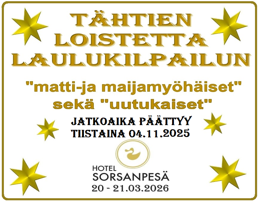 JOS OLET KADOTTANUT FINAALIKUTSUN ja/tai SE ON HUKKUNUT "bittitaivaaseen" TOIMI SEURAAVASTI: Maksa ohjelmapalvelumaksu 35 e Op tilille: Tähtien Loistetta FI27 5419 0120 0335 88 viite 20 00299. Saat infokirjeen aikatauluineen marras- joulukuussa 2025. LUE säännöt.
