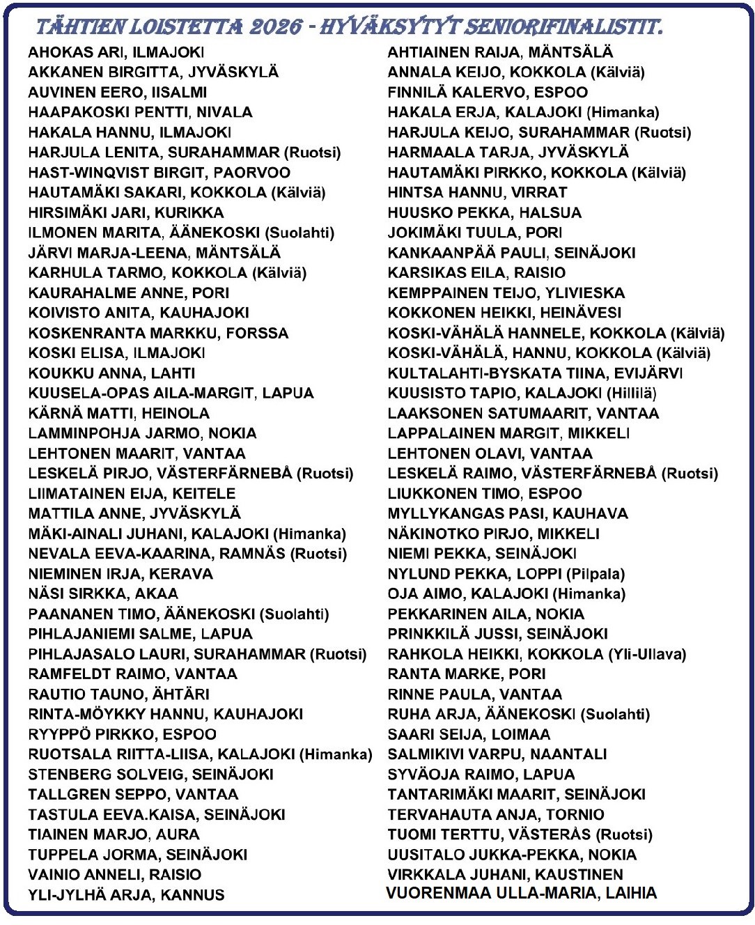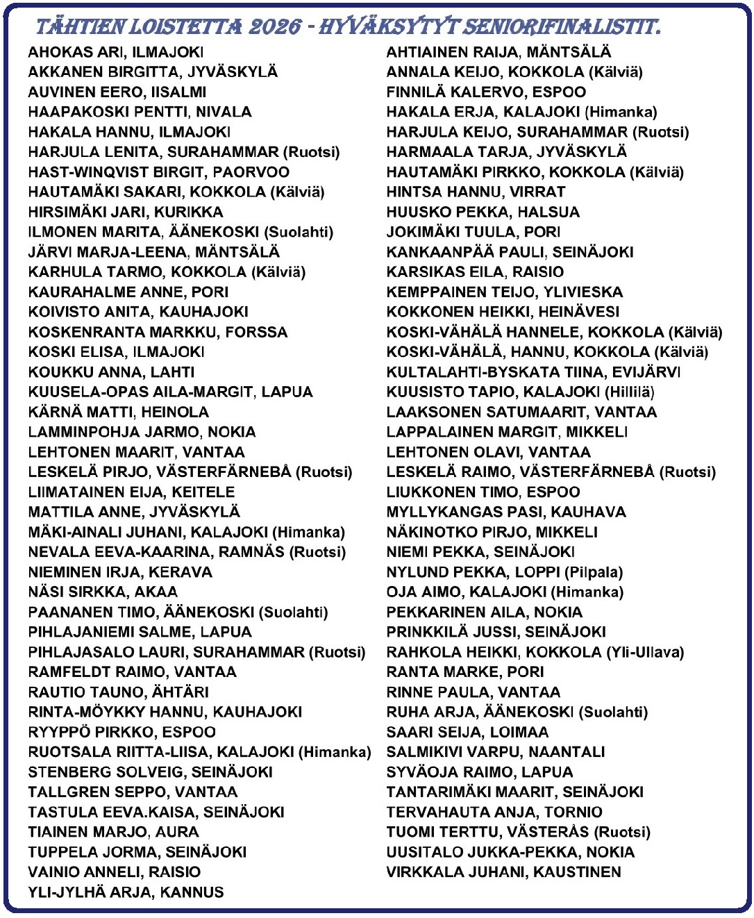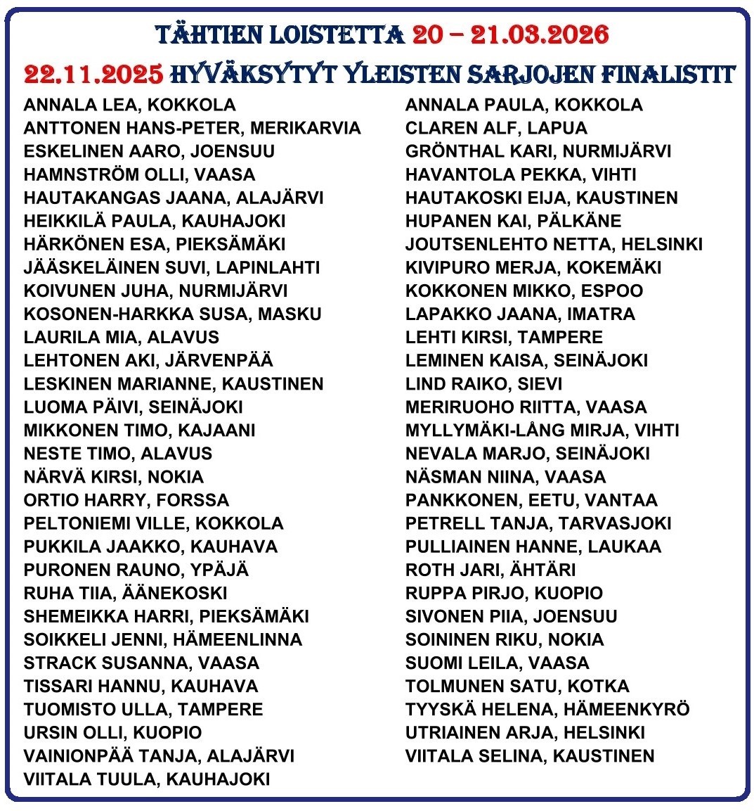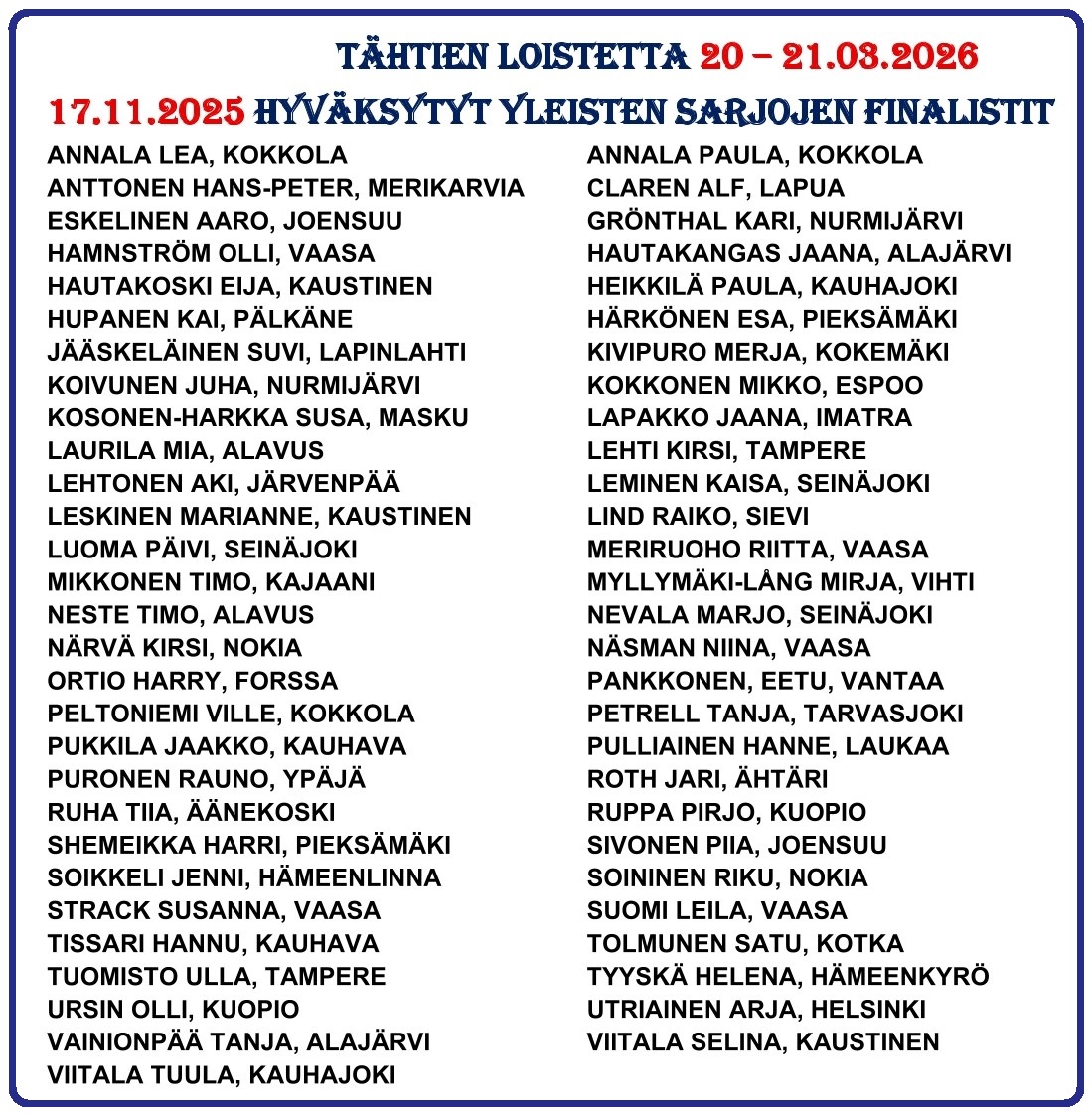 SENIOREILLE - paikalle perjantaina 20.03.2026 - klo 14 vahvistus infokirjeessä. YLEISILLE SARJOILLE - paikalle lauantaina 21.03.2026 kello 12. Vahvistus infokirjeessä.