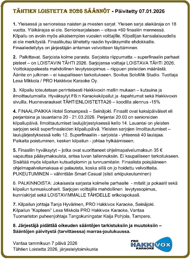 NYT olemme olleet ajoissa liikkeellä. Suomen vanhimpana karaokekilpailujen järjestäjänä Hakkivox on luonut oman ja toimivan formaatin. Jota vielä vähän parantelimme 2026 finaaliin. Uutuutena on se, että kappaleet tarvitsee ilmoittaa vasta finaaliin ilmoittautumisen yhteydessä - paikalla olevan laululistan järjestyksessä.