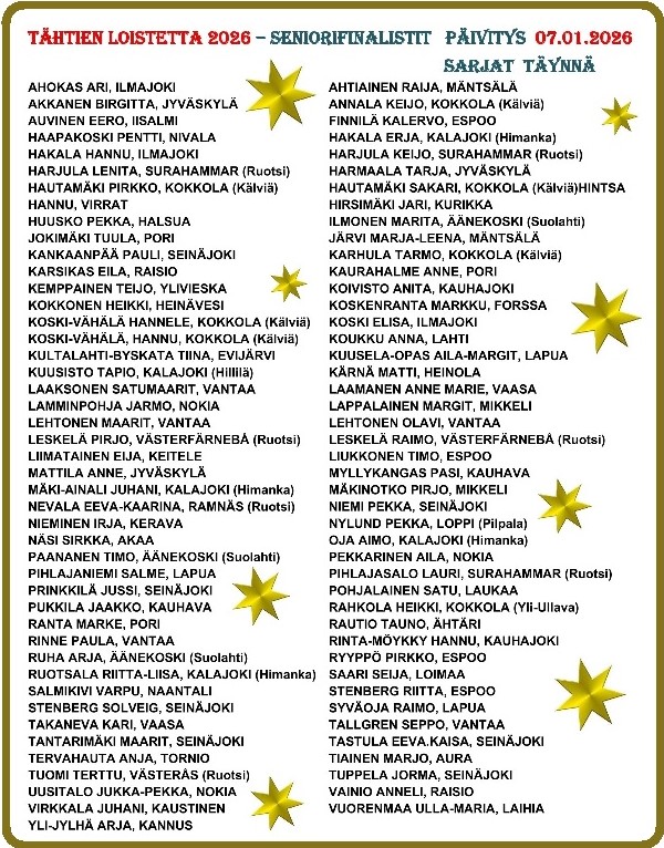 LAULUJÄRJESTYSLISTAT JULKAISTAAN FINAALIPÄIVÄNÄ. JOTEN KAIKKIEN FINALSITIEN OLTAVA PAIKALLA - TUNTIA ENNEN FINAALIN ALKAMISTA.