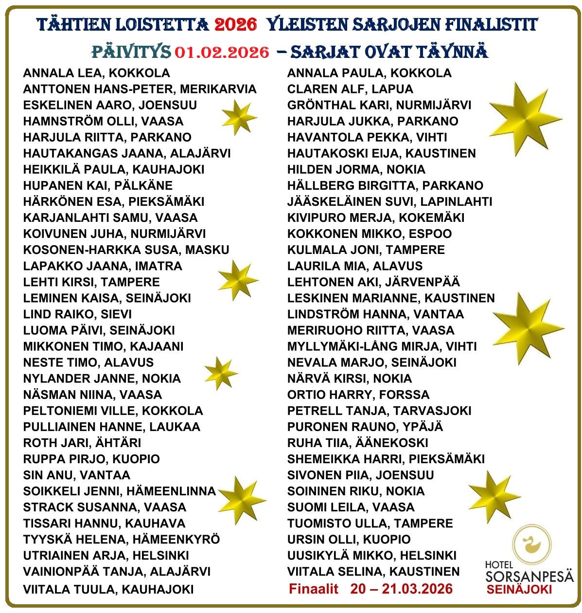 LA 21.03 yleiset I-kierros klo 13 ja superfinaalit klo 18.00. Ruokailut - kuten perjantaina